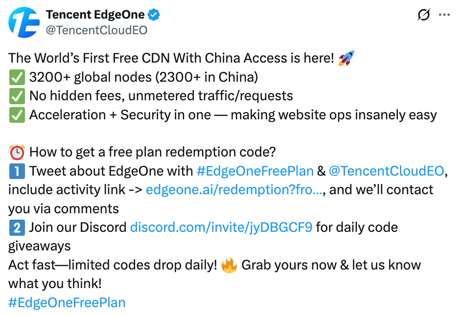 直到今年腾讯云EdgeOne免费套餐内侧,于是趁着周末有空就把CDN全部切到了EdgeOne。