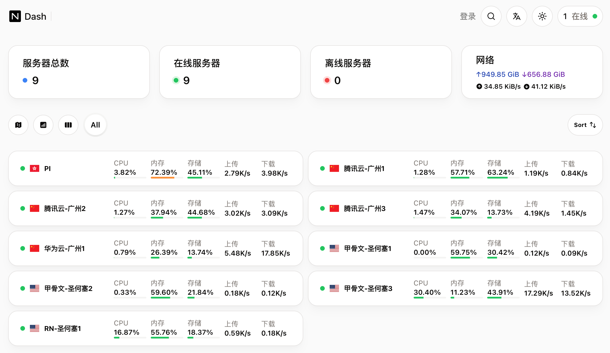 之前的监控已经很久没维护了,所以周末的时候逐步将探针改到了哪吒探针 。等我财富自由的那天,我将点亮全球的小鸡 ✈️