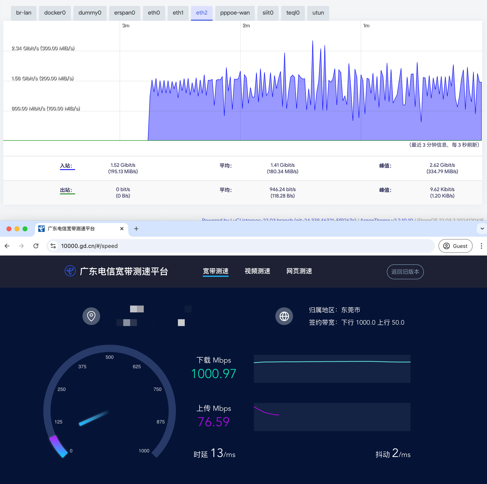 当播放 147 路,OpenWrt 监测 ITV 口带宽平均速率达到了 1.42Gps,约 1500Mbps。这个时候访问电信官网测速,下行下降到了两位数,在20-100Mbps 之间波动。