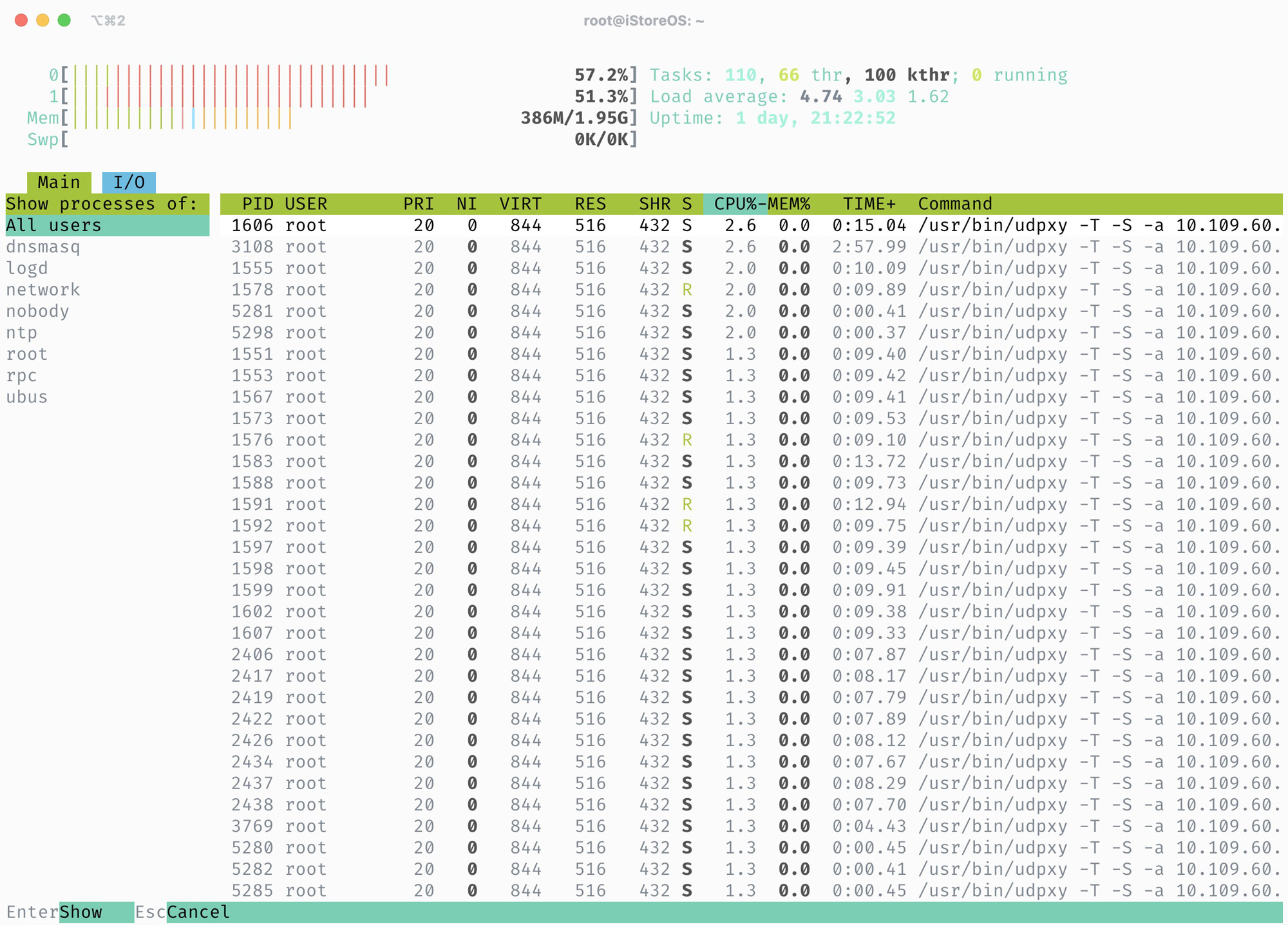 当 55 个通道同时播放时,CPU使用率在 50% 到 70% 之间波动,每个 UDPXY 进程占用 1%到2% 的CPU。但是可以推测,如果继续使用 UDPXY 进行转发,播放到 100 路的时候,CPU 占有率的确有可能达到 100%。