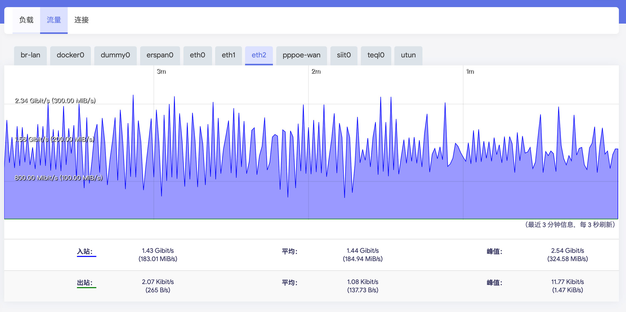 在 147 路播放时,OpenWrt 监测 ITV 口带宽平均速率达到了 1.42 Gbps,约 1454 Mbps。后续尝试再增加无法突破。